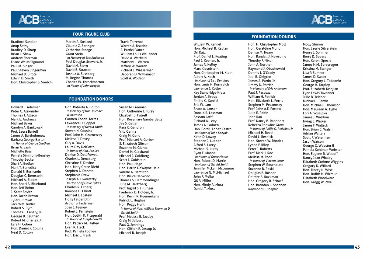 Hon. H. Christopher Mott Hon. Geraldine Mund Denise M. Neary Hon. Randall J. Newsome Timothy F. Nixon John A. Northen Raymond J. Obuchowski Dennis J. O’ Grady Joel R. Ohlgren James A. Pardo, Jr. Jimmy D. Parrish In Memory of Eric Anderson Paul J. Pascuzzi William H. Patrick Hon. Elizabeth L. Perris Stephen M. Pezanosky Prof. John A. E. Pottow Julie E. Rabin John Rao Prof. Nancy B. Rapoport Rebecca Redwine Grow In Honor of Philip O. Redwine, Jr. Michael H. Reed David L. Resnick Hon. Steven W. Rhodes Lynne F. Riley Peter J. Roberts Prof. Mark J. Roe Melissa M. Root In Honor of Vincent Lazar Stephen W. Rosenblatt Suzanne B. Roski Douglas B. Rosner Deirdre B. Ruckman Hon. Gregory R. Schaaf Hon. Brendan L. Shannon Raymond L. Shapiro