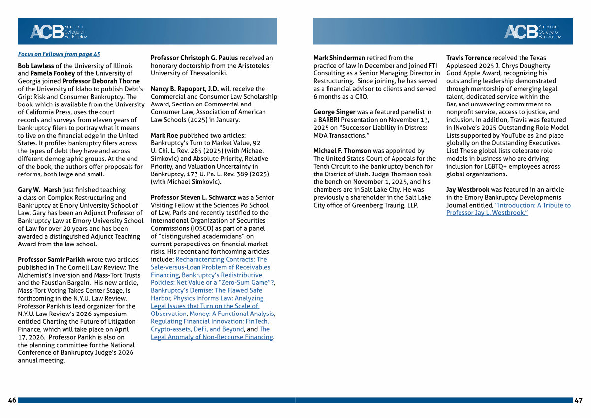 Mark Roe published two articles: Bankruptcy’ s Turn to Market Value, 92 U. Chi. L. Rev. 285( 2025)( with Michael Simkovic) and Absolute Priority, Relative Priority, and Valuation Uncertainty in Bankruptcy, 173 U. Pa. L. Rev. 389( 2025)( with Michael Simkovic).
