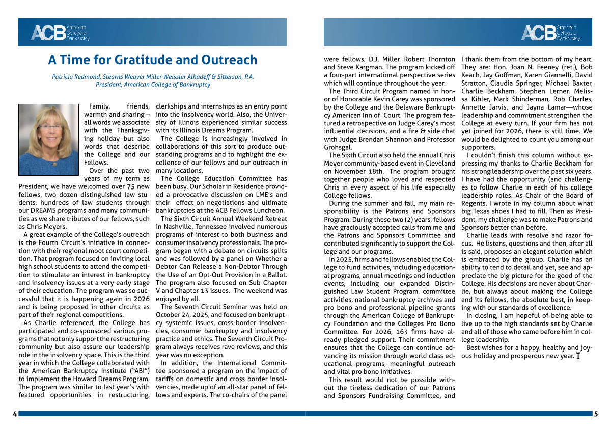 In 2025, firms and fellows enabled the College to fund activities, including educational programs, annual meetings and induction events, including our expanded Distinguished Law Student Program, committee activities, national bankruptcy archives and pro bono and professional pipeline grants through the American College of Bankruptcy Foundation and the Colleges Pro Bono Committee. For 2026, 163 firms have already pledged support. Their commitment ensures that the College can continue advancing its mission through world class educational programs, meaningful outreach and vital pro bono initiatives.