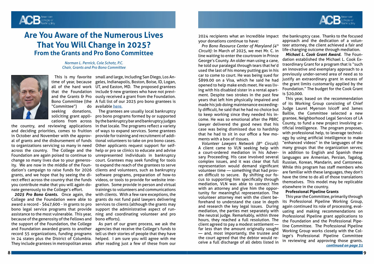 This is my favorite time of year, because all of the hard work that the Foundation and the Grants & Pro Bono Committee( the“ Committee”) do seeking donations, soliciting grant applications from across the country, and reviewing applications and deciding priorities, comes to fruition in October and November with the approval of grants and the disbursement of funds to organizations servicing so many in need across the country. The College and the Foundation are again poised to continue to change so many lives due to your generosity. We are now in the middle of the Foundation’ s campaign to raise funds for 2026 grants, and we hope that by seeing the direct effect across the country that the funds you contribute make that you will again donate generously to the College’ s effort.