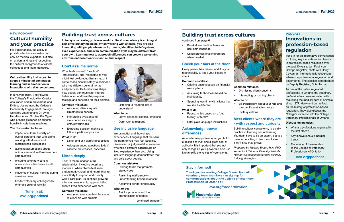 In a new podcast, Emily Ewles, the College’ s Principal for Quality Assurance and Improvement, and Krithika Jeyaraman, the College’ s Community Engagement Strategist, welcome veterinarians Dr. Lynn Henderson and Dr. Jennifer Ogeer, who provide guidance on cultural humility in veterinary medicine.