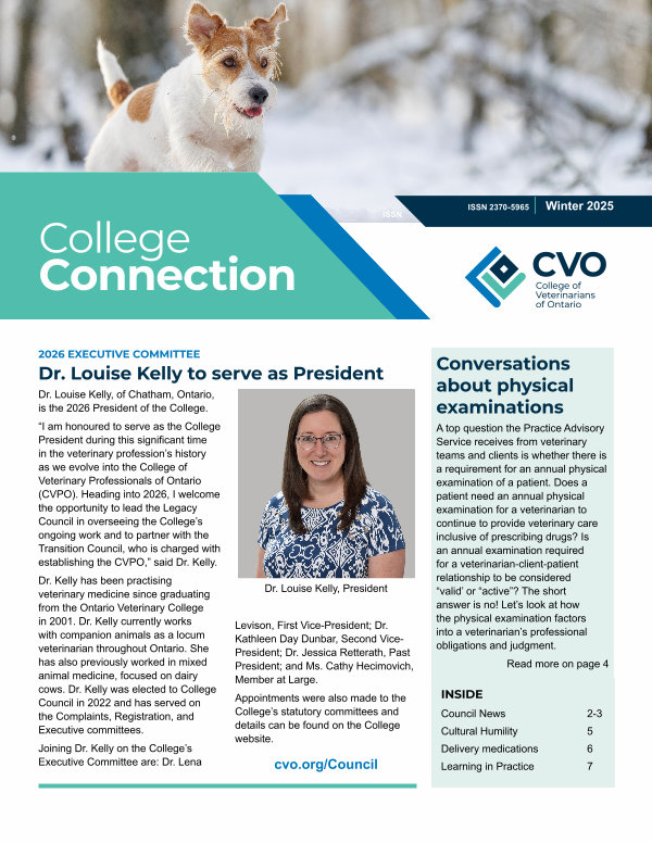 “ I am honoured to serve as the College President during this significant time in the veterinary profession’ s history as we evolve into the College of Veterinary Professionals of Ontario( CVPO). Heading into 2026, I welcome the opportunity to lead the Legacy Council in overseeing the College’ s ongoing work and to partner with the Transition Council, who is charged with establishing the CVPO,” said Dr. Kelly.