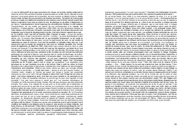 prématurée, pourrissement. La mort sent mauvais? Comment s’ en débarrasser [ Amédée, Ionesco, 1953 ] autrement que par la performation d’ un système linguistique désincarné? En sa ronde bosse, mon crâne a vu mes premiers rapports au sexe, il a vu la main fouisseuse, il a vu le corps qui exulte, il a vu la vie qui fait son travail. « Arrivé aujourd’ hui au midi de ma vie » [ La Div Com, Dante ], je me retourne, je lève les yeux au ciel, je regarde la base et le sommet d’ un étrange parcours, je « rêve d’ une vie nouvelle, à chaque seconde recommencée », à chaque seconde que je fantasme, que je suis tendu vers, à chaque seconde, un sursaut d’ espoir quand le corps, lui, en ses tensions même, parle de déficit, d’ usure, d’ inclination, de fatigue. Sous mon crâne cranant, « j’ ai embrassé l’ aube d’ été » [ Rimbaud ]. Depuis une trentaine d’ années, j’ ai vu évoluer les cabinets de curiosité en une suite de cadres comprimant des corps abimés, une enfilade d’ écrans emboîtés les uns à la suite des autres. Si j’ avais douze ans aujourd’ hui, j’ irais dénicher le secret des alcôves, l’ amour des dieux chers à Ovide, les sur-males et les amazones, sur un site pornographique. Je verrais les emboitements, les gymnastiques, les contorsions, les gros plans des vulves et des verges, les rougeurs et les moiteurs, les humeurs, les bouches torves, et j’ entendrais les cris. Je n’ aurais aucun mal à comparer ça à la douleur, à la torture, à la souffrance. Je n’ aurais pas conscience que ces corps se prostituent, qu’ ils sont là pour me divertir, et qu’ enfin je puisse en jouir, seul, pour le moins. Si j’ avais été adolescent en 1902, je serais allé dans une petite rue de Mons, j’ aurais frappé à une porte, une dame m’ aurait accueilli et moyennant un écu de 5 francs, je me serais retrouvé dans un salon à choisir parmi des filles à moitié dévêtu celle qui m’ aurait accompagné dans une chambre à l’ étage. Quelques années plus tard, je serais devenu soldat et j’ aurais vécu la Grande Boucherie. Aujourd’ hui, il y a sur nos écrans beaucoup de cadavres et tout autant de corps entre baisés mais vous en conviendrez, il est absolument malvenu de montrer deux corps qui s’ aiment dans le plus simple appareil quand des séances de dissections passent comme une lettre à la poste. « Mais maman ils ne sont pas vraiment morts? Non mon chéri c’ est du cinéma. Ils font semblant. » Puis: « Mais maman, ils ne sont pas vraiment en train de faire l’ amour? Non mon enfant, ils sont en train de baiser parce que le sexe en action ça excite et ça rapporte. » Un siècle nous sépare de ces deux modes de monstration mais le régime n’ a pas changé, le régime des corps est toujours le même: celui du contrôle absolu [ Deleuze( 1992)]. Il est absolument interdit de se balader nu ou de faire l’ amour dans un espace public et de montrer à la télévision des appareils génitaux, au nom de la morale qui est la notion la plus irrationnelle qui soit, il est interdit de vendre une partie de son corps contre du sexe pour un temps donné et d’ en exiger l’ emploi par une rémunération quand 75 % des Belges sont salariés, il est vivement recommandé sous forme d’ injonctions publicitaires diligentés par les services publics de mourir dans une chambre d’ hôpital et de prendre soin de son corps, de penser à ses obsèques, de souscrire une assurance-vie et de ne pas se suicider, il est interdit aux familles d’ enterrer le corps de leur proche dans une forêt, dans un jardin d’ enfance, dans la terre des origines, il est interdit de manger ses morts, de faire l’ amour avec, il est interdit de ne pas indiquer aux autorités compétentes l’ heure, le jour, l’ origine d’ un décès qui nous est proche, il est interdit enfin de s’ appartenir corps et âmes, puisque, nous venons de le démontrer, l’ âme pas plus que le corps, n’ ont d’ importance, car s’ ils en avaient, nous fabriquerions avec des monstres, des monstres assoiffés de sens et de signes, des monstres subversifs, qui en une nuit de tempête [ PI, Wilcox, 1956 ], nous dévoreraient tous pour nous permettre de renaître, oui, de renaître à la Vita nuova, la vie nouvelle.