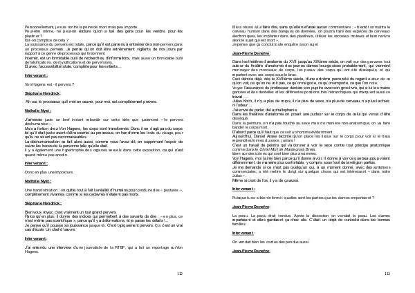 Intervenant: Von Hagens est- il pervers? Stéphane Hendrick: Ah oui, le processus qu’ il met en œuvre, pour moi, est complètement pervers. Nathalie Nyst: