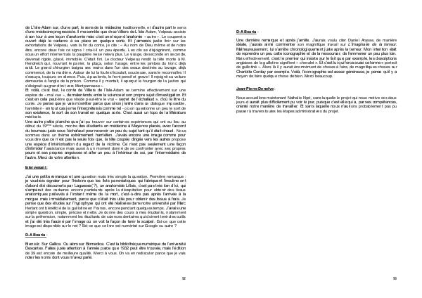 de L’ Isle-Adam sur, d’ une part, le sens de la médecine traditionnelle, et d’ autre part le sens d’ une médecine progressiste. Il me semble que chez Villiers de L’ Isle-Adam, Velpeau assiste à son tour à une leçon d’ anatomie mais c’ est une leçon d’ anatomie « autre ». Le couperet a ouvert déjà le cadavre à sa place en quelque sorte. Et j’ aimerais juste finir sur les exhortations de Velpeau, vers la fin du conte, je cite: « Au nom de Dieu même et de notre être, encore deux fois ce signe! cria-t-il un peu éperdu. Les cils se disjoignirent, comme sous un effort interne mais la paupière ne se releva plus. Le visage, de seconde en seconde, devenait rigide, glacé, immobile. C ' était fini. Le docteur Velpeau rendit la tête morte à M. Hendreich qui, rouvrant le panier, la plaça, selon l ' usage, entre les jambes du tronc déjà raidi. Le grand chirurgien baigna ses mains dans l ' un des seaux destinés au lavage, déjà commencé, de la machine. Autour de lui la foule s ' écoulait, soucieuse, sans le reconnaître. Il s ' essuya, toujours en silence. Puis, à pas lents, le front pensif et grave! Il rejoignit sa voiture demeurée à l ' angle de la prison. Comme il y montait, il aperçut le fourgon de la justice qui s ' éloignait au grand trot vers Montparnasse ». Et voilà, c’ est tout, le conte de Villiers de l’ Isle-Adam se termine effectivement sur une espèce de « mal vue », de malentendu entre la science et son propre sujet d’ investigation. Et c’ est en cela peut-être que réside peut-être le vrai « secret de l’ échafaud », d’ où le titre du conte. Je pense que je vais m’ arrêter parce que sinon j’ entre dans ce dialogue impossible, hamlétien- en tout cas je me l’ interpréterais comme tel- où on questionne un peu le sort de son existence, le sort de son travail en quelque sorte. C’ est aussi un topo de la littérature médicale. Une autre petite planche que j’ ai pu trouver sur certaines expériences qui ont eu lieu au début du 19 ème siècle, montre des étudiants en médecine à Mayence placés, avec l’ accord du bourreau juste sous l’ échafaud pour recevoir un peu du sujet tant qu’ il était chaud. Nous sommes dans un thème extrêmement hamlétien. J’ avais encore une image comme pour vous dire que ce n’ est pas la seule fois que, la tête coupée dirigée vers les autres propose une espèce d’ intériorisation du regard de la victime. Ce n’ est pas seulement une façon d’ intimider l’ assistance mais aussi à un moment donné de se confronter avec ses propres peurs et ses propres angoisses et aller un peu à l’ intérieur de soi, par l’ intermédiaire de l’ autre. Merci de votre attention.