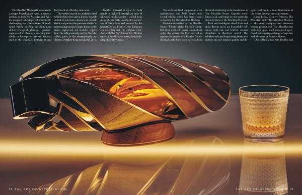 The Macallan Horizon is presented in a unique bespoke glass vessel , a material intrinsic to both The Macallan and Bentley , designed to be displayed horizontally , challenging the conventions of traditional whisky bottling . An aluminium ribbon envelops the glass and is precision engineered to Bentley ’ s exacting standards , in homage to this key material used in the sculptural foundation and bodywork of a Bentley motorcar .