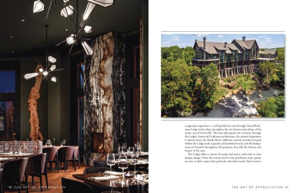 a signature experience — a self-guided art tour through Grand Bohemian Lodge where they can explore the art , history and culture of the iconic city of Greenville . The tour takes guests on a journey through the Lodge ’ s American Craftsman architecture , the natural inspiration it derives from the Reedy River , different natural wonders housed within the Lodge such as geodes and petrified wood , and the Indigenous art featured throughout the property that tells the history and beauty of the area .