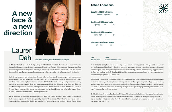 In March of 2025, Landmark Realty Group and Landmark Vacation Rentals named industry veteran Lauren Dahl as their new General Manager and Broker-in-Charge. Bringing more than 15 years of experience in property management, brokerage leadership, and real estate education, Dahl will oversee Landmark’ s five real estate sales and vacation rental offices across Sapphire, Cashiers, and Highlands.