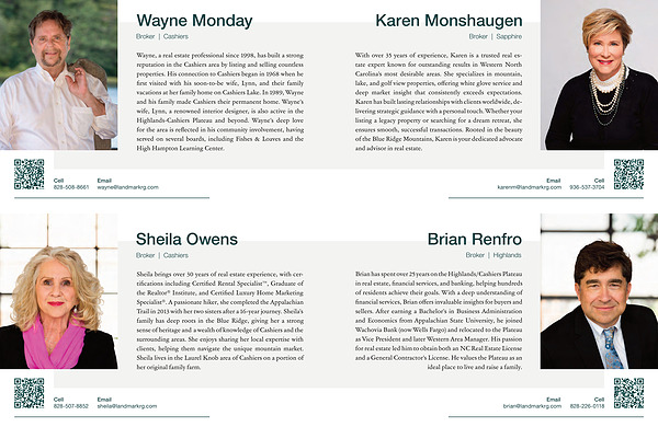 Brian has spent over 25 years on the Highlands / Cashiers Plateau in real estate, financial services, and banking, helping hundreds of residents achieve their goals. With a deep understanding of financial services, Brian offers invaluable insights for buyers and sellers. After earning a Bachelor’ s in Business Administration and Economics from Appalachian State University, he joined Wachovia Bank( now Wells Fargo) and relocated to the Plateau as Vice President and later Western Area Manager. His passion for real estate led him to obtain both an NC Real Estate License and a General Contractor’ s License. He values the Plateau as an ideal place to live and raise a family.