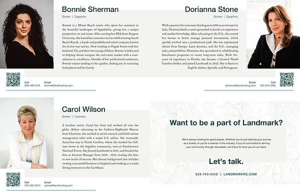 A London native, Carol has lived and worked all over the globe. Before relocating to the Cashiers-Highlands Plateau from Charlotte, she worked in social research and held various management roles with a major U. S. airline. She eventually found her way to North Carolina, where she marked her fulltime home in the Sapphire community, next to Panthertown National Forest. She Joined Landmark in 2014, and headed the firm as General Manager from 2018- 2025, leading the firm to new levels of success. Her diverse background also includes owning a successful business in England and working as a scuba diving instructor in the Caribbean.