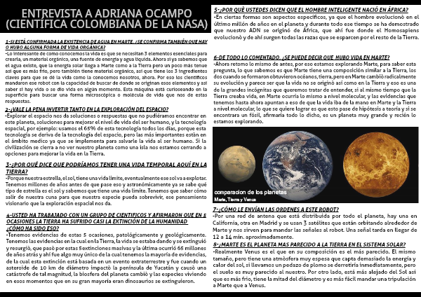 -Ahora retomo lo mismo de antes, por eso estamos explorando Marte, para saber esta pregunta, lo que sabemos es que Marte tiene una composición similar a la Tierra, los dos cuando se formaron obtuvieron océanos, tierra, pero en Marte cambiò radicalmente su evolución y parece ser que la vida no se originò así como en la Tierra y eso es una de la grandes incógnitas que queremos tratar de entender, si al mismo tiempo que la Tierra creaba vida, en Marte ocurría lo mismo a nivel molecular, y las evidencias que tenemos hasta ahora apuntan a eso de que la vida iba de la mano en Marte y la Tierra a nivel molecular, lo que se quiere lograr es que esto pase de hipótesis a teoría y si se encontrara un fósil, afirmaría todo lo dicho, es un planeta muy grande y recién lo estamos explorando.