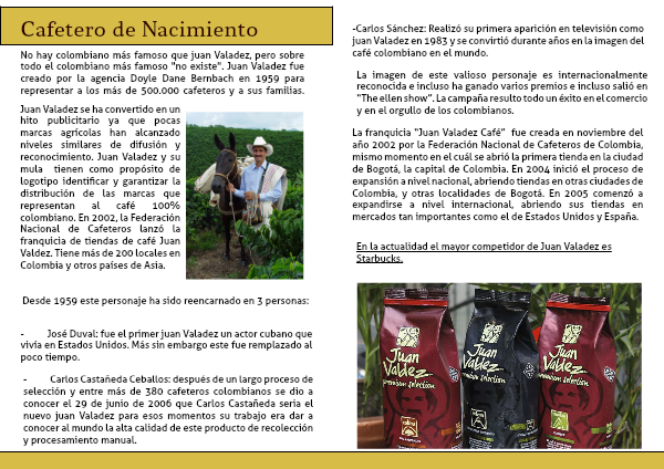 No hay colombiano más famoso que juan Valadez, pero sobre todo el colombiano más famoso "no existe". Juan Valadez fue creado por la agencia Doyle Dane Bernbach en 1959 para representar a los más de 500.000 cafeteros y a sus familias.