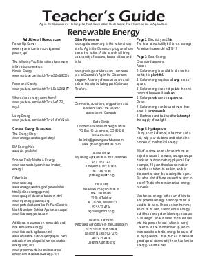 Page 3: Solar Energy Crossword answers: Across 2. Solar energy is available all over the world; it is plentiful. 3. Solar energy requires a large area of space. 5. Solar energy does not pollute the environment because it is clean. 6. Solar panels can be expensive. Down 1. Solar energy can be used more than once; it is renewable. 4. Darkness and bad weather interrupt the supply of sunlight.