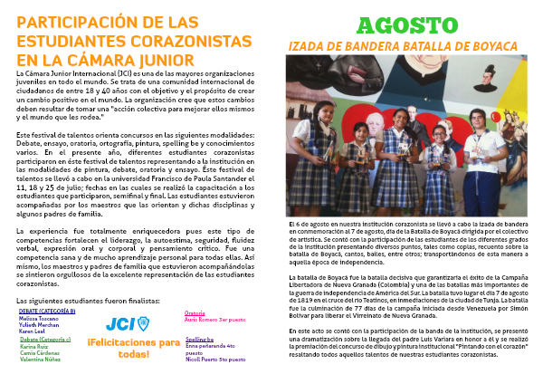 Este festival de talentos orienta concursos en las siguientes modalidades: Debate, ensayo, oratoria, ortografía, pintura, spelling be y conocimientos varios. En el presente año, diferentes estudiantes corazonistas participaron en éste festival de talentos representando a la institución en las modalidades de pintura, debate, oratoria y ensayo. Éste festival de talentos se llevó a cabo en la universidad Francisco de Paula Santander el 11, 18 y 25 de julio; fechas en las cuales se realizó la capacitación a los estudiantes que participaron, semifinal y final. Las estudiantes estuvieron acompañadas por los maestros que las orientan y dichas disciplinas y algunos padres de familia.