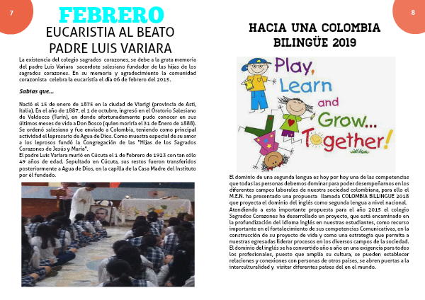 Atendiendo a esta importante propuesta para el año 2015 el colegio Sagrados Corazones ha desarrollado un proyecto, que está encaminado en la profundización del idioma inglés en nuestras estudiantes, como recurso importante en el fortalecimiento de sus competencias Comunicativas, en la construcción de su proyecto de vida y como una estrategia que permita a nuestras egresadas liderar procesos en los diversos campos de la sociedad.