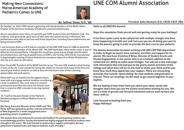 I was fortunate, both as a D.O and as a member of the UNE COM Class of 1988 to attend the event as a board member of the Maine AAP. The AAP board does these mixers twice a year in different sites around Maine. I thought this would be a great way to mingle local Portland area Pediatricians with future pediatricians at COM's new facility. COM will be instrumental in beginning the training of future Pediatricians to replace those of us Maine Pediatricians who are at or close to retirement.