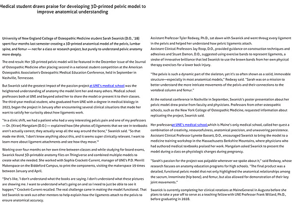 University of New England College of Osteopathic Medicine student Sarah Swanick (D.O., ’28) spent four months last semester creating a 3D-printed anatomical model of the pelvis, lumbar spine, and femur — not for a class or research project, but purely to understand pelvic anatomy more deeply.