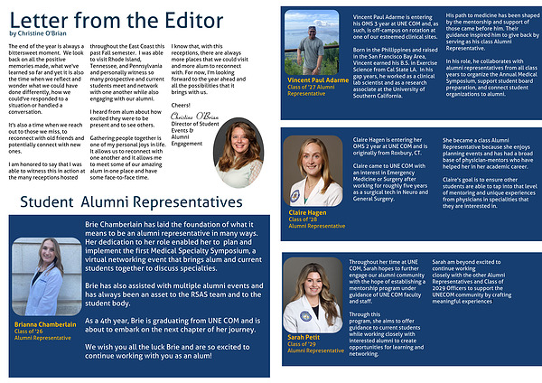 Brie Chamberlain has laid the foundation of what it means to be an alumni representative in many ways. Her dedication to her role enabled her to plan and implement the first Medical Specialty Symposium, a virtual networking event that brings alum and current students together to discuss specialties.