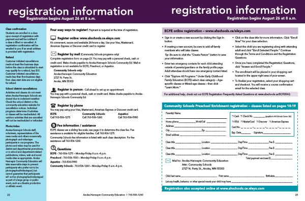 Community Schools Preschool Enrichment registration – classes listed on pages 18-19