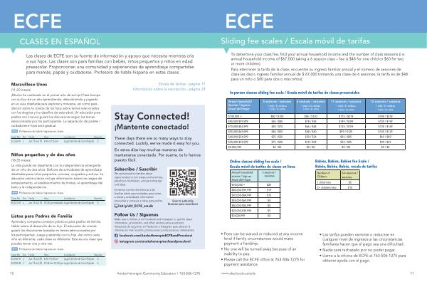 Las clases de ECFE son su fuente de información y apoyo que necesita mientras cría a sus hijos . Las clases son para familias con bebés , niños pequeños y niños en edad preescolar . Proporcionan una comunidad y experiencias de aprendizaje compartidas para mamás , papás y cuidadores . Profesora de habla hispana en estas clases .