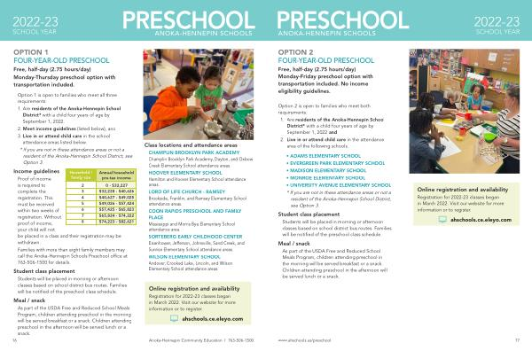Option 1 is open to families who meet all three requirements : 1 . Are residents of the Anoka-Hennepin School District * with a child four years of age by September 1 , 2022 . 2 . Meet income guidelines ( listed below ), and 3 . Live in or attend child care in the school attendance areas listed below . * If you are not in these attendance areas or not a resident of the Anoka-Hennepin School District , see Option 3 .