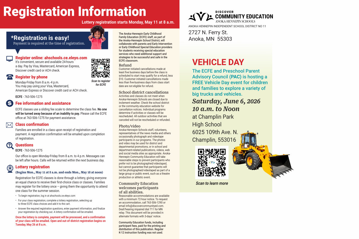 Reasonable accommodations are available with a minimum 72-hour notice. To request an accommodation, call 763-506-1290 or email info @ discovercommunityed. com. Deaf / hearing impaired dial 711 for MN relay. This document will be provided in alternate formats with 3-days’ notice.