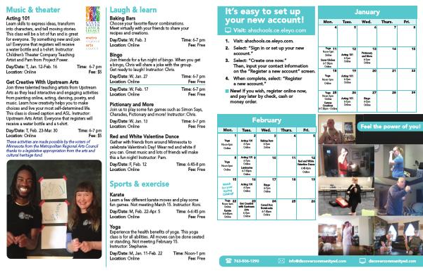 Feel the power of you ! 763-506-1290 info @ discovercommunityed . com discovercommunityed . com Cereal Box Notebooks 6-7:30pm Online Tues . Wed . Thurs . Fri . February Mon . Tues . Wed . Thurs . Fri . 1 8 15 22 2 9 16 23 3 10 17 24 4 11 18 25 5 12 19 26 Luminaries 6-7:30pm Online Yoga Noon-1pm Online Karate 6-6:45pm Online Get Creative with Upstream Arts 6-7pm Online Baking Bars 6-7pm Online Acting 101 6-7pm Online Acting 101 6-7pm Online Acting 101 6-7pm Online 27 Yoga Noon-1pm Online Yoga Noon-1pm Online Yoga Noon-1pm Online Red and White Valentine Dance 6:45-8pm Online Yoga Noon-1pm Online Watch for your Spring Catalog ! Bingo 6-7pm Online Tues . Wed . Thurs . Fri . January Mon . Tues . Wed . Thurs . Fri . Snow Globes 6-7:30pm Online Pictionary and More 6-7pm Online Acting 101 6-7pm Online Acting 101 6-7pm Online Acting 101 6-7pm Online Yoga Noon-1pm Online Canvas Creations 6-7:30pm - Online It ’ s easy to set up your new account !
