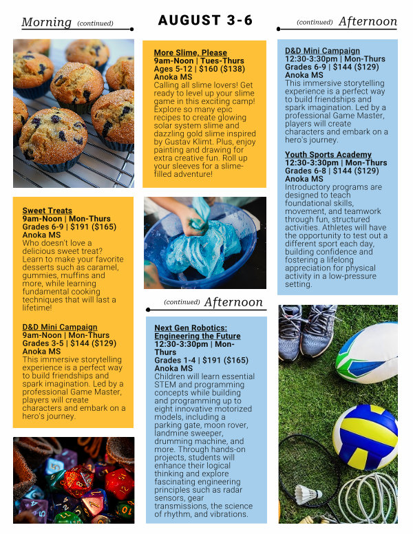 Youth Sports Academy 12:30-3:30pm | Mon-Thurs Grades 6-8 | $ 144($ 129) Anoka MS Introductory programs are designed to teach foundational skills, movement, and teamwork through fun, structured activities. Athletes will have the opportunity to test out a different sport each day, building confidence and fostering a lifelong appreciation for physical activity in a low-pressure setting.