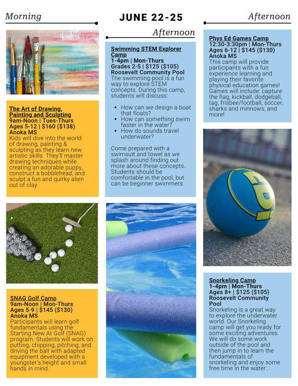 Ed Games Camp 12:30-3:30pm | Mon-Thurs Ages 6-12 | $ 145($ 130) Anoka MS This camp will provide participants with a fun experience learning and playing their favorite physical education games! Games will include: capture the flag, kickball, dodgeball, tag, frisbee / football, soccer, sharks and minnows, and more!