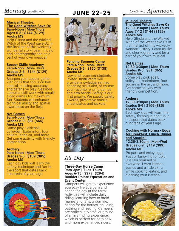 Archery 9am-Noon | Mon-Thurs Grades 3-5 | $ 109($ 85) Anoka MS Each day kids will learn the safety, technique and fun in the sport that dates back hundreds of years ago.