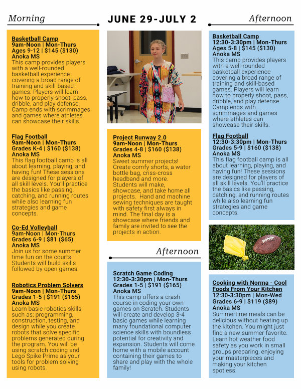 Flag Football 9am-Noon | Mon-Thurs Grades K-4 | $ 160($ 138) Anoka MS This flag football camp is all about learning, playing, and having fun! These sessions are designed for players of all skill levels. You’ ll practice the basics like passing, catching, and running routes while also learning fun strategies and game concepts.
