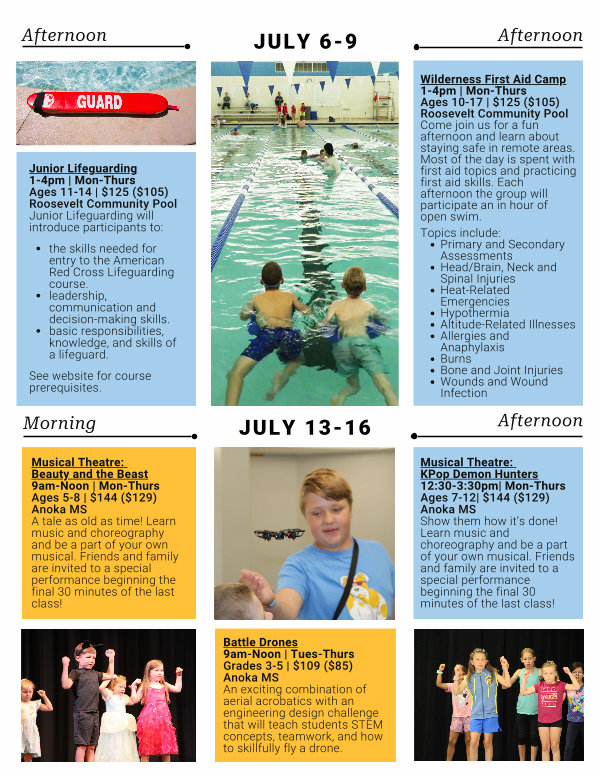 Musical Theatre: Beauty and the Beast 9am-Noon | Mon-Thurs Ages 5-8 | $ 144($ 129) Anoka MS A tale as old as time! Learn music and choreography and be a part of your own musical. Friends and family are invited to a special performance beginning the final 30 minutes of the last class!