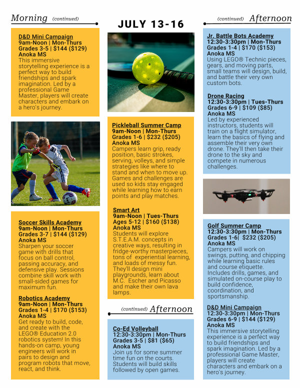 Soccer Skills Academy 9am-Noon | Mon-Thurs Grades 3-7 | $ 144($ 129) Anoka MS Sharpen your soccer game with drills that focus on ball control, passing accuracy, and defensive play. Sessions combine skill work with small-sided games for maximum fun.