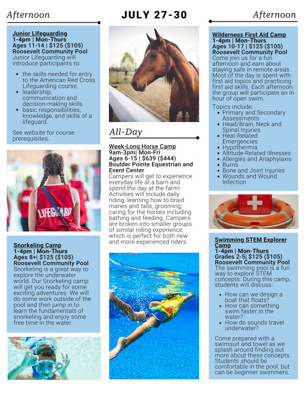 First Aid Camp 1-4pm | Mon-Thurs Ages 10-17 | $ 125($ 105) Roosevelt Community Pool Come join us for a fun afternoon and earn about staying safe in remote areas. Most of the day is spent with first aid topics and practicing first aid skills. Each afternoon the group will participate an in hour of open swim.