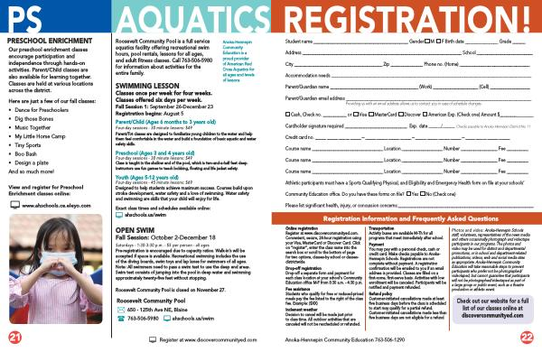 Cash , Check no . ___________ or Visa MasterCard Discover American Exp . ( Check one ) Amount $____________________ Cardholder signature required _____________________________ Exp . date _________/_________ Checks payable to Anoka-Hennepin District No . 11 Credit card no . ________ ________ ________ ________ — ________ ________ ________ ________ — ________ ________ ________ ________ — _______ ________ ________ ________ Course name _________________________________ Location ___________________ Number _________________ Fee __________ Course name _________________________________ Location ___________________ Number _________________ Fee __________ Course name _________________________________ Location ___________________ Number _________________ Fee __________ Athletic participants must have a Sports Qualifying Physical , and Eligibility and Emergency Health form on file at your schools ’ Community Education office . Do you have these forms on file ? Yes No ( Check one ) Please list significant health , injury , or concussion concerns :_______________________________________________________________ Registration Information and Frequently Asked Questions