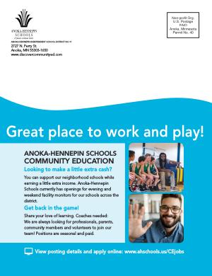You can support our neighborhood schools while earning a little extra income . Anoka-Hennepin Schools currently has openings for evening and weekend facility monitors for our schools across the district .