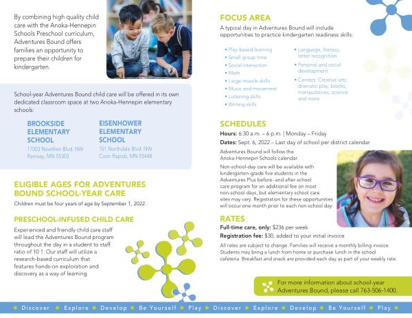 School-year Adventures Bound child care will be offered in its own dedicated classroom space at two Anoka-Hennepin elementary schools :