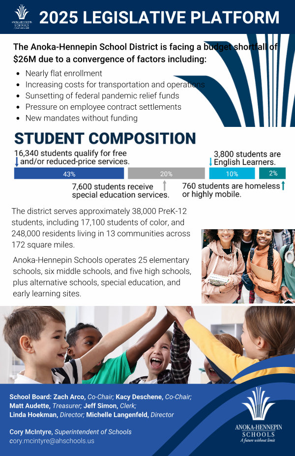Anoka-Hennepin Schools operates 25 elementary schools, six middle schools, and five high schools, plus alternative schools, special education, and early learning sites.