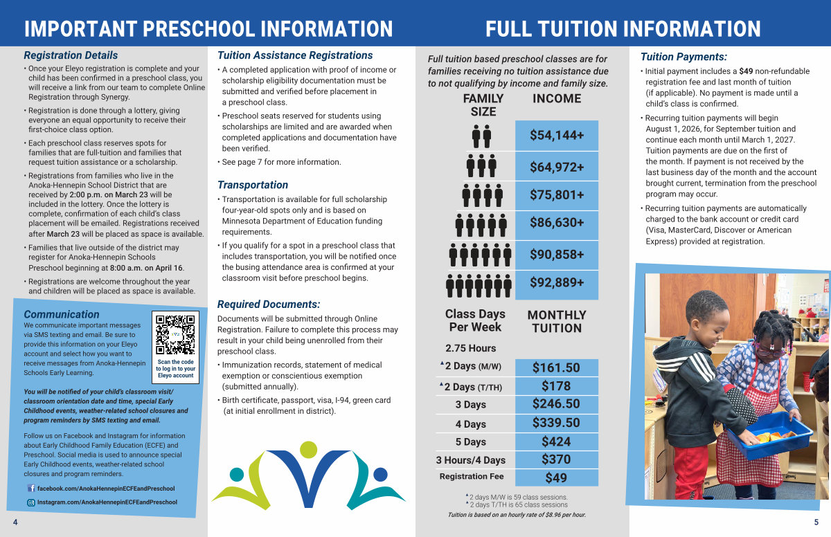 • Recurring tuition payments will begin August 1, 2026, for September tuition and continue each month until March 1, 2027. Tuition payments are due on the first of the month. If payment is not received by the last business day of the month and the account brought current, termination from the preschool program may occur.