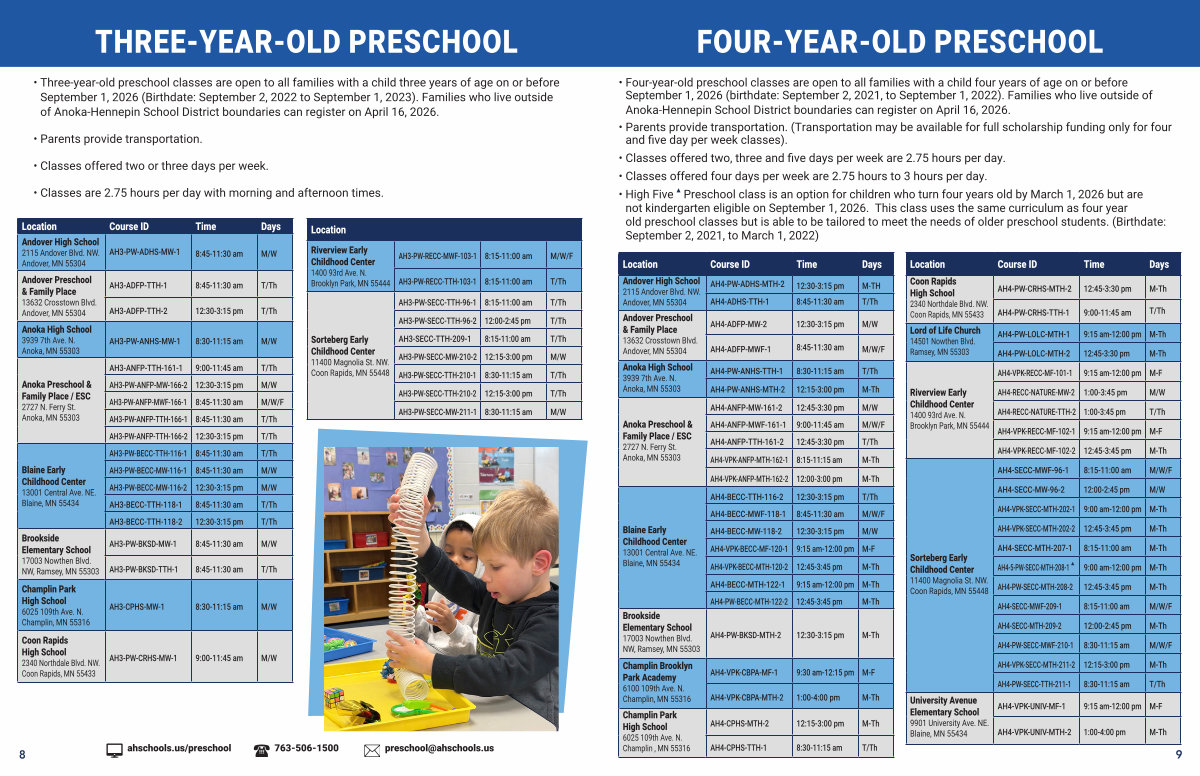 • Three-year-old preschool classes are open to all families with a child three years of age on or before September 1, 2026( Birthdate: September 2, 2022 to September 1, 2023). Families who live outside of Anoka-Hennepin School District boundaries can register on April 16, 2026.