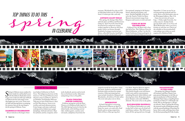 SpringFest It ’ s back ! SpringFest is returning to Downtown Cleburne on April 27 . Enjoy live music , arts and crafts , food booths and an eating competition . Kids will have a blast getting their