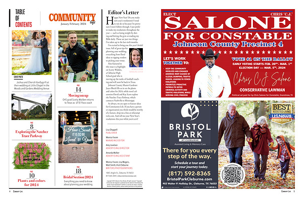 Johnson County Master Gardener Joyce Block fills us in on the plants and colors for 2024 , while travel columnists David and Kay Scott explore the Natchez Trace Parkway , which connects Nashville to Mississippi .