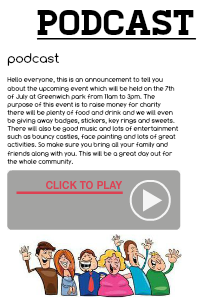 Hello everyone, this is an announcement to tell you about the upcoming event which will be held on the 7th of July at Greenwich park from 11am to 3pm. The purpose of this event is to raise money for charity there will be plenty of food and drink and we will even be giving away badges, stickers, key rings and sweets. There will also be good music and lots of entertainment such as bouncy castles, face painting and lots of great activities. So make sure you bring all your family and friends along with you. This will be a great day out for the whole community.