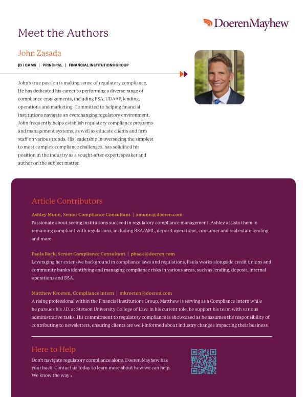 Paula Back , Senior Compliance Consultant | pback @ doeren . com Leveraging her extensive background in compliance laws and regulations , Paula works alongside credit unions and community banks identifying and managing compliance risks in various areas , such as lending , deposit , internal operations and BSA .