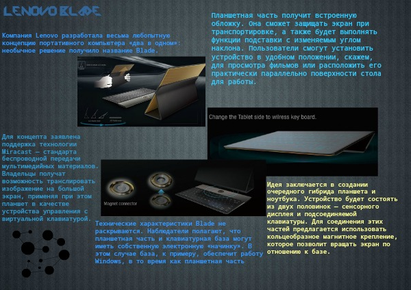 Идея заключается в создании очередного гибрида планшета и ноутбука. Устройство будет состоять из двух половинок — сенсорного дисплея и подсоединяемой клавиатуры. Для соединения этих частей предлагается использовать кольцеобразное магнитное крепление, которое позволит вращать экран по отношению к базе.