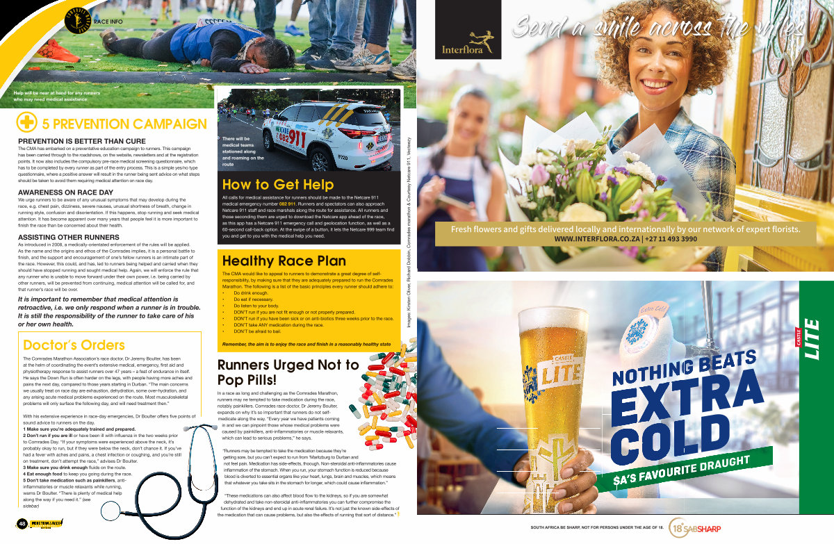 With his extensive experience in race-day emergencies, Dr Boulter offers five points of sound advice to runners on the day. 1 Make sure you’ re adequately trained and prepared. 2 Don’ t run if you are ill or have been ill with influenza in the two weeks prior to Comrades Day.“ If your symptoms were experienced above the neck, it’ s probably okay to run, but if they were below the neck, don’ t chance it. If you’ ve had a fever with aches and pains, a chest infection or coughing, and you’ re still on treatment, don’ t attempt the race,” advises Dr Boulter. 3 Make sure you drink enough fluids on the route. 4 Eat enough food to keep you going during the race. 5 Don’ t take medication such as painkillers, antiinflammatories or muscle relaxants while running, warns Dr Boulter.“ There is plenty of medical help along the way if you need it.”( see sidebar)