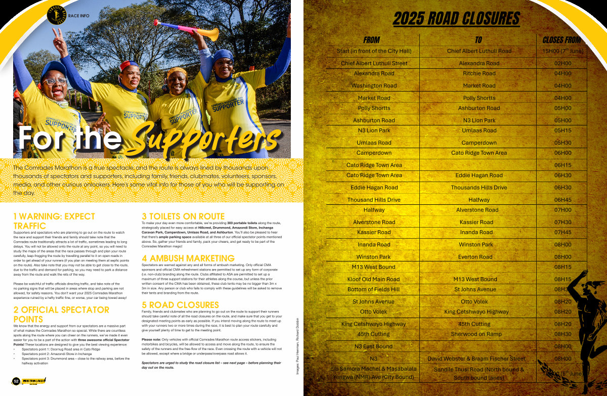 The Comrades Marathon is a true spectacle, and the route is always lined by thousands upon thousands of spectators and supporters, including family, friends, clubmates, volunteers, sponsors, media, and other curious onlookers. Here’ s some vital info for those of you who will be supporting on the day.