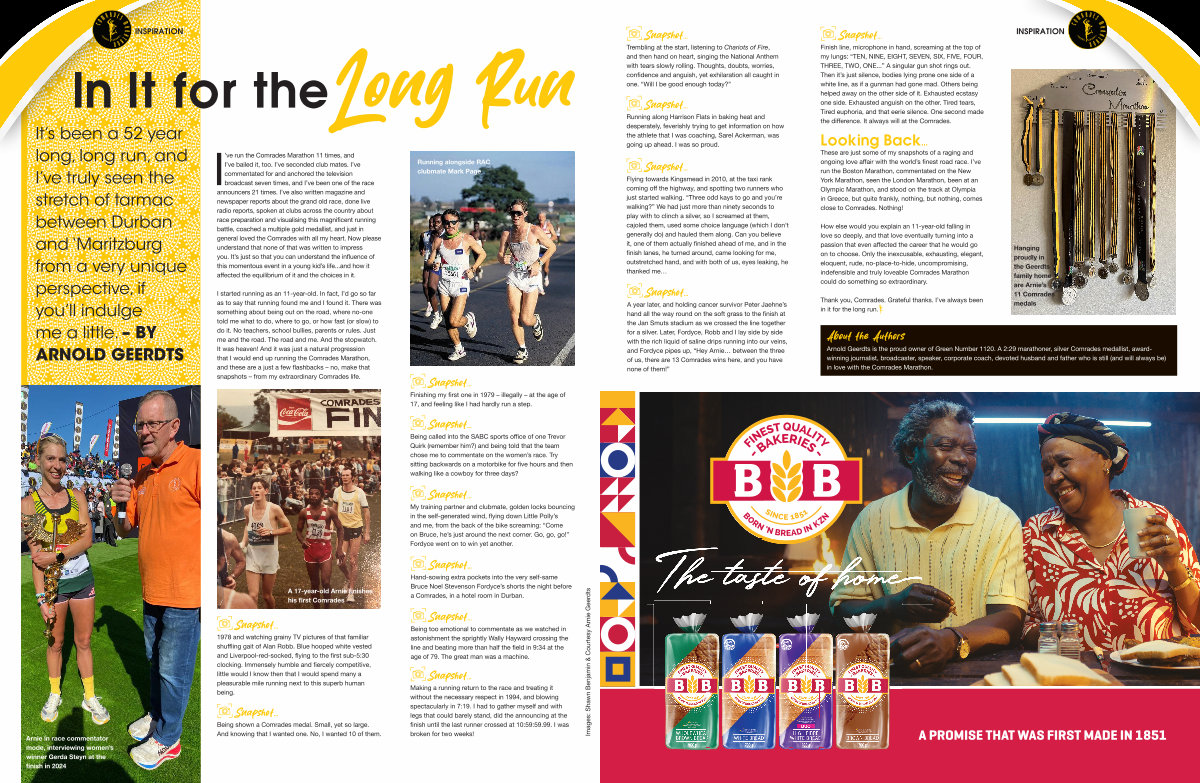 Arnold Geerdts is the proud owner of Green Number 1120. A 2:29 marathoner, silver Comrades medallist, awardwinning journalist, broadcaster, speaker, corporate coach, devoted husband and father who is still( and will always be) in love with the Comrades Marathon.