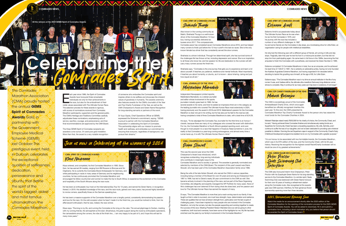 Watch the media for an announcement shortly after the 2025 edition of the Comrades Marathon for the opening of the nomination process for the 2025 GEMS Spirit of Comrades Awards. You will be asked to download, fill in and submit a nomination form, including a short motivation why you believe that person should be awarded the Spirit of Comrades Award.