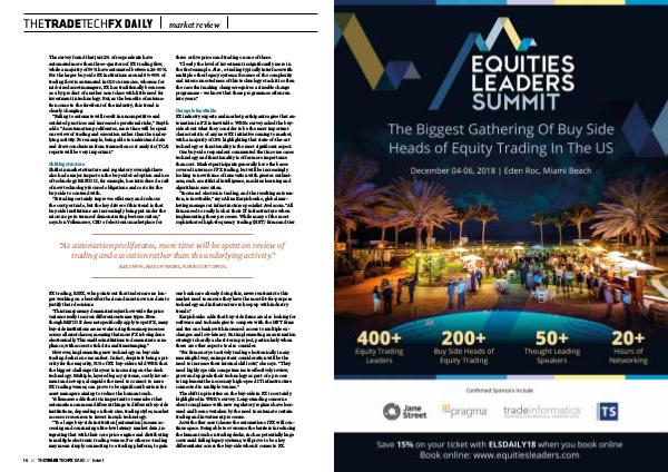 “ Failing to automate will result in uncompetitive and outdated practices and increased operational risks,” Smyth adds.“ As automation proliferates, more time will be spent on review of trading and execution rather than the underlying activity. For example, being able to understand data and draw conclusions from transaction cost analysis( TCA) reports will be very important.”